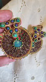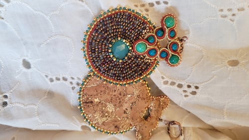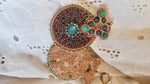 des Calcédoines accompagnées de turquoises vertes et de chrysocolles sur un délicat travail de broderie avec soutache.