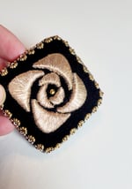 Retour apaisant à l'époque Art Deco pour cette rose stylisée entièrement brodée au fil d'or selon une technique traditionnelle et éternelle.
