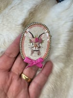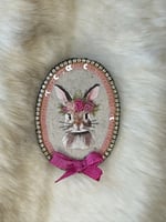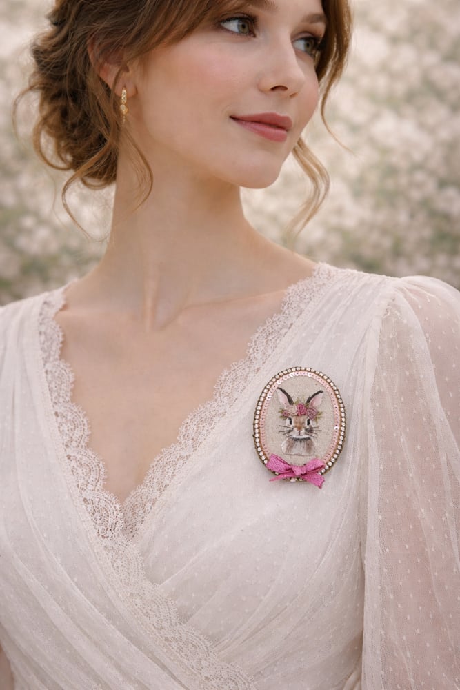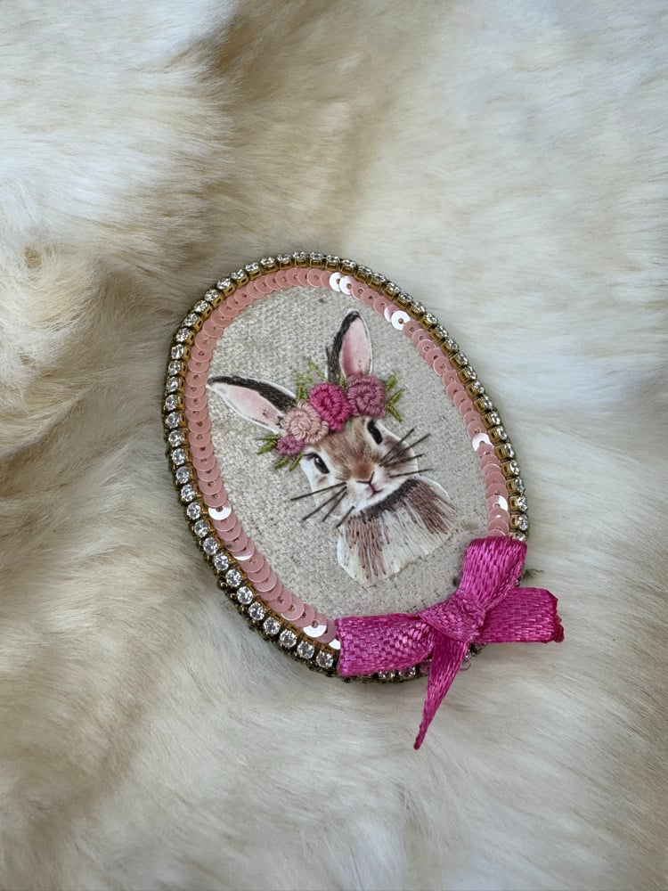 Une broche comme une miniature textile, où un petit lapin couronné de fleurs prend vie sous les fils.