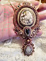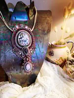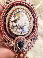 " Turquoise blanche" ( wild horse, pierre de lune et tourmaline. Le tout brodé sur du cuir .
