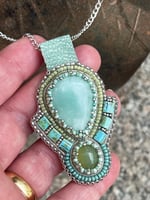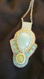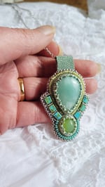 Au centre une sublime amazonite et deux magnifiques calcédoines vertes pour un petit collier délicat ras du cou, léger et facile à porter.